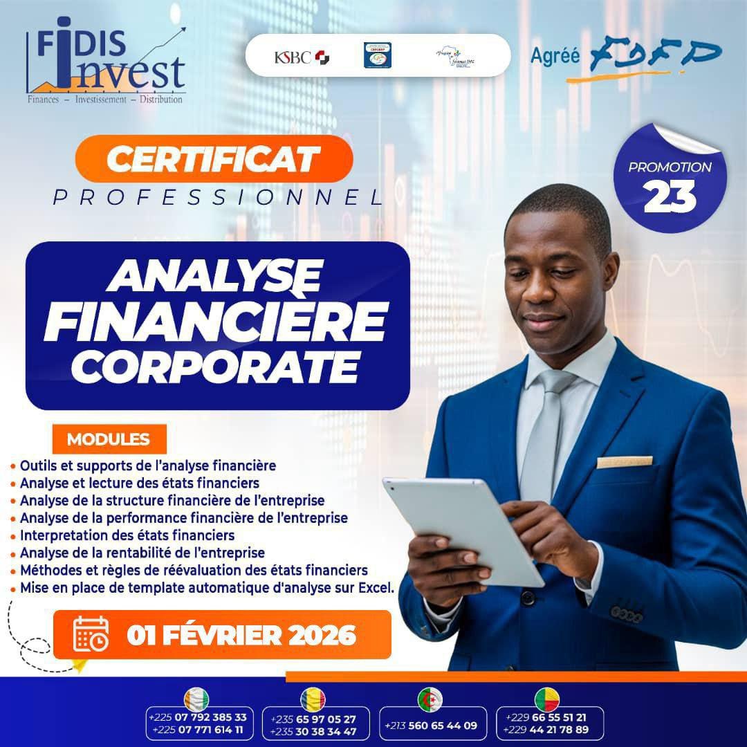 Le Cabinet FIDIS-INVEST agréé par le FDFP en partenariat avec le Cabinet de Conseils CEFOREP SARL vous offrent une certification en Analyse financière corporate, à partir du 01 février 2026