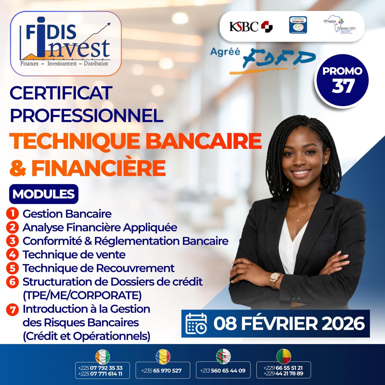 Le Cabinet FIDIS-INVEST agréé par le FDFP en partenariat avec le Cabinet de Conseils CEFOREP SARL vous offrent une certification en Technique Bancaire et Financière, à partir du 08 février 2026