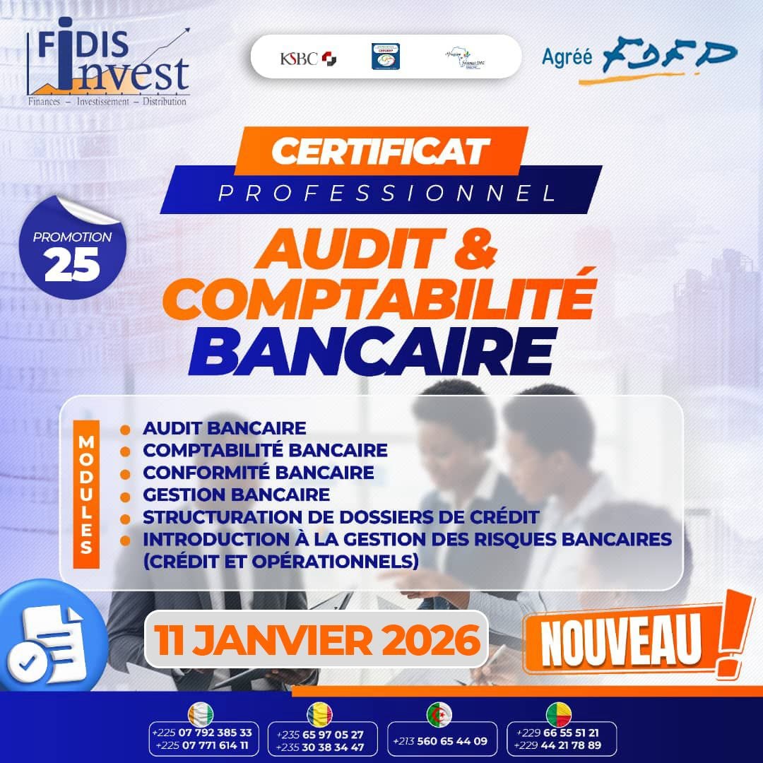 Le Cabinet FIDIS-INVEST agréé par le FDFP en partenariat avec le Cabinet de Conseils CEFOREP SARL vous offrent une certification en Audit Comptabilité Bancaire, à partir du 11 Janvier 2026