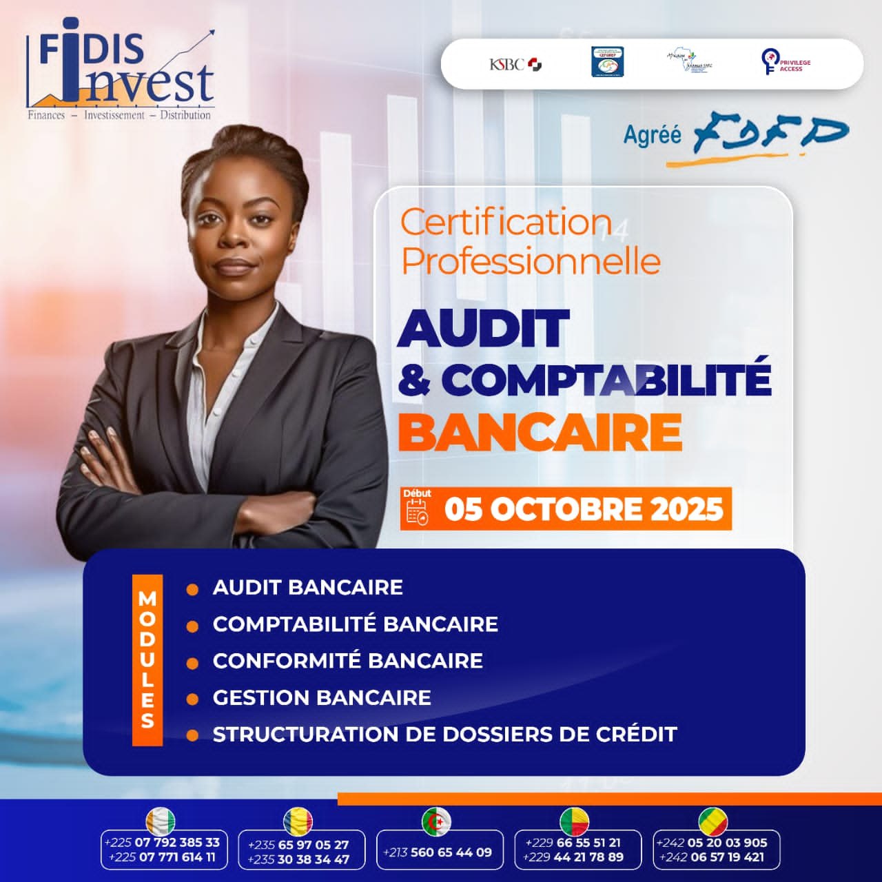 Le Cabinet FIDIS-INVEST agréé par le FDFP en partenariat avec le Cabinet de Conseils CEFOREP SARL vous offrent une formation en Audit & Comptabilité Bancaire, à partir du 05 Octobre 2025