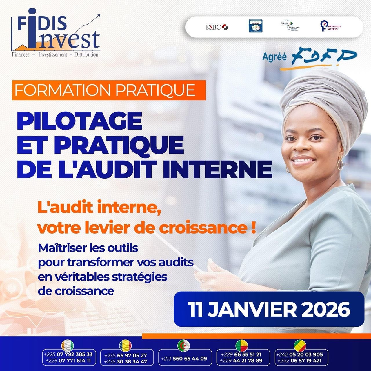 Le Cabinet FIDIS-INVEST agréé par le FDFP en partenariat avec le Cabinet de Conseils CEFOREP SARL vous offrent une certification en Pilotage et Pratique de l’Audit Interne, à partir du 11 Janvier 2026