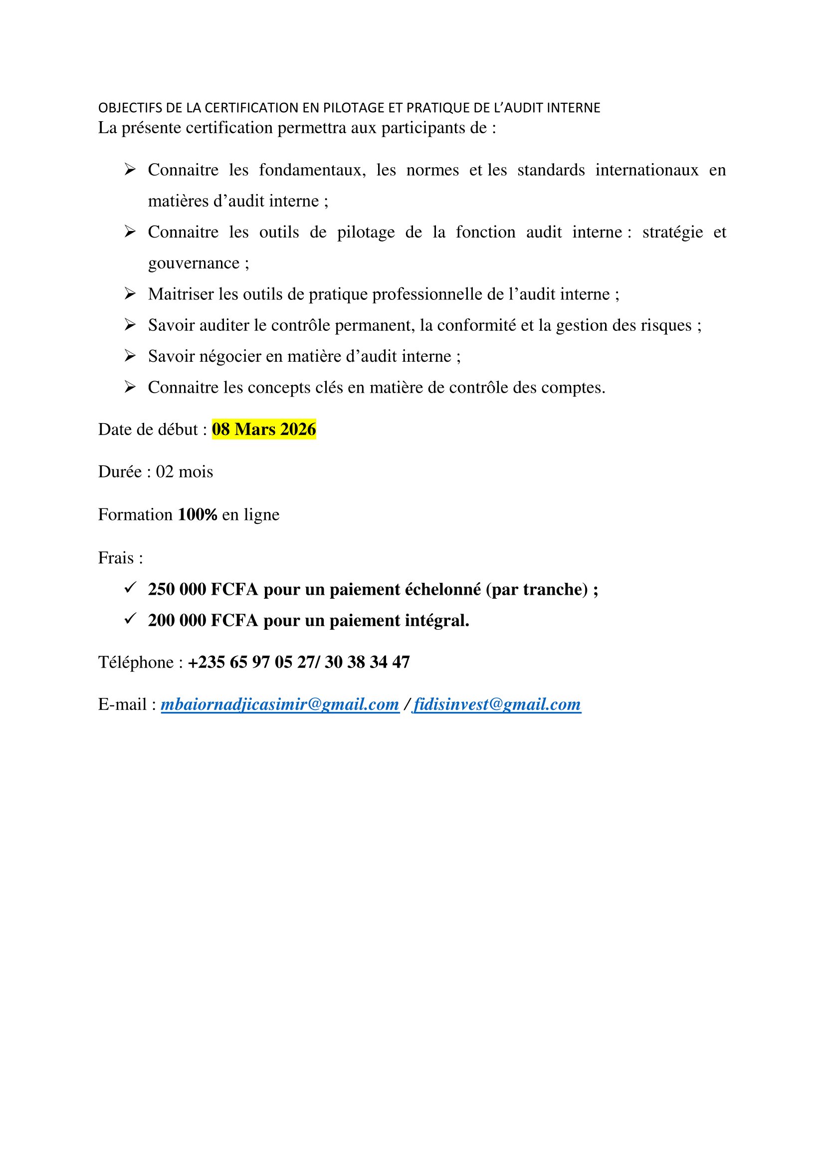 Le Cabinet FIDIS Invest lance un certification en Pilotage et Pratique de l’Audit Interne Fév 18, 2026 Le Cabinet FIDIS Invest lance un certification en Pilotage et Pratique de l’Audit Interne Share on FacebookTweetFollow usSaveCatholic Relief Services recrute un assistant administratif (H/F), Amzoer, TchadLe Conseil danois pour les réfugiés (DRC) recrute un(e) Stagiaire en consolidation de la paix – Travailleur temporaire, LibyeRecod Solutions IT recrute un stagiaire développeur (H/F), Dakar, SénégalAfrican Parks recrute un(e) Responsable Financier(e), Park National de Zakouma, Tchad