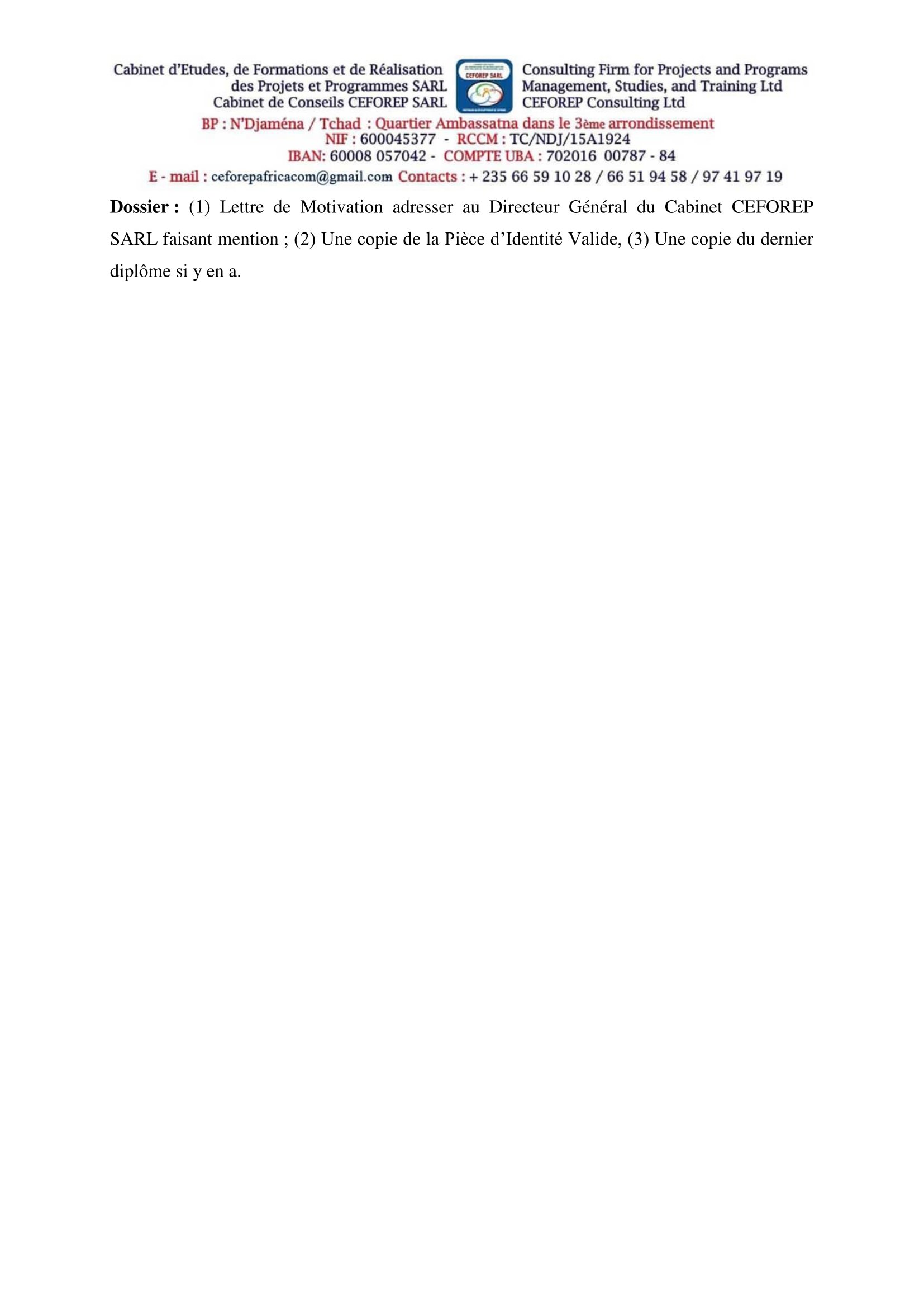Le Cabinet CEFOREP SARL lance le Programme d’Accompagnement des Entrepreneurs, N’Djamena, Tchad Fév 11, 2026 Le Cabinet CEFOREP SARL lance le Programme d’Accompagnement des Entrepreneurs, N’Djamena, Tchad Share on FacebookTweetFollow usSaveDanChurchAid (DCA) recherche un(e) stagiaire RH, MaliLe NRC recrute un Education Officer (H/F), Adré, TchadCatholic Relief Services (CRS) lance un avis d’appel d’offres pour la fourniture et la livraison de seize climatiseurs, N’Djamena, TchadCEFOREP SARL organise une formation en HQSE & Montage des DAO, Gestion de Projets BTP & MS Project, N’Djamena, Tchad