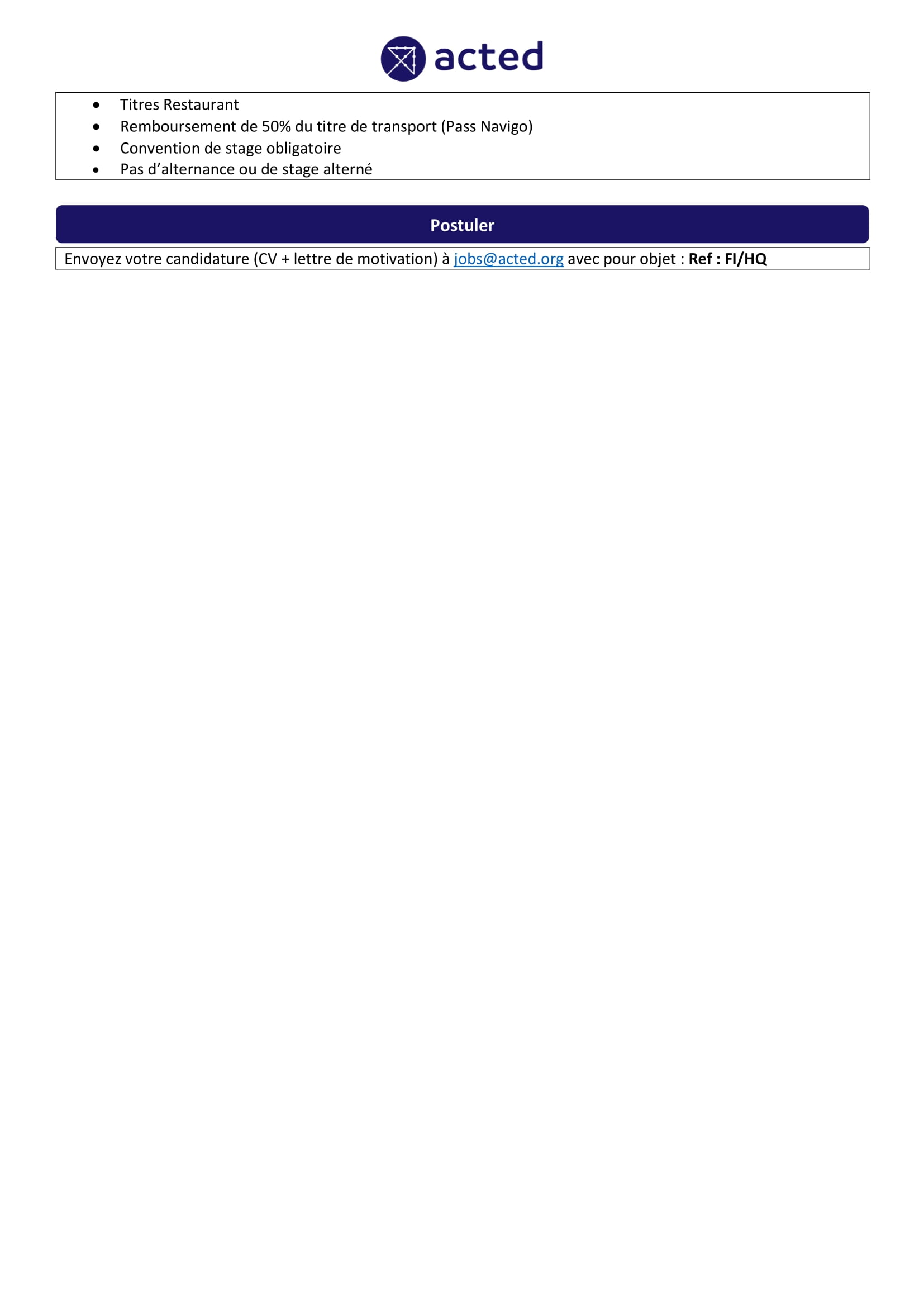 Acted recherche un stagiaire Contrôle de Gestion, Paris, France Août 6, 2025 Acted recherche un stagiaire Contrôle de Gestion, Paris, France Share on FacebookTweetFollow usSaveLe Fonds des Nations Unies pour l’enfance (UNICEF) recherche un(e) Stagiaire International en Changement Climatique, Yaoundé, Cameroun Bourses d’études ums de l’université Sebelas Maret, IndonésieAppel à candidatures pour les bourses George F Kennan du Wilson Center, USA Le Programme des Nations Unies pour le développement (PNUD) recrute deux stagiaires en Communication (spécialité photo & vidéo), N’Djamena, Tchad