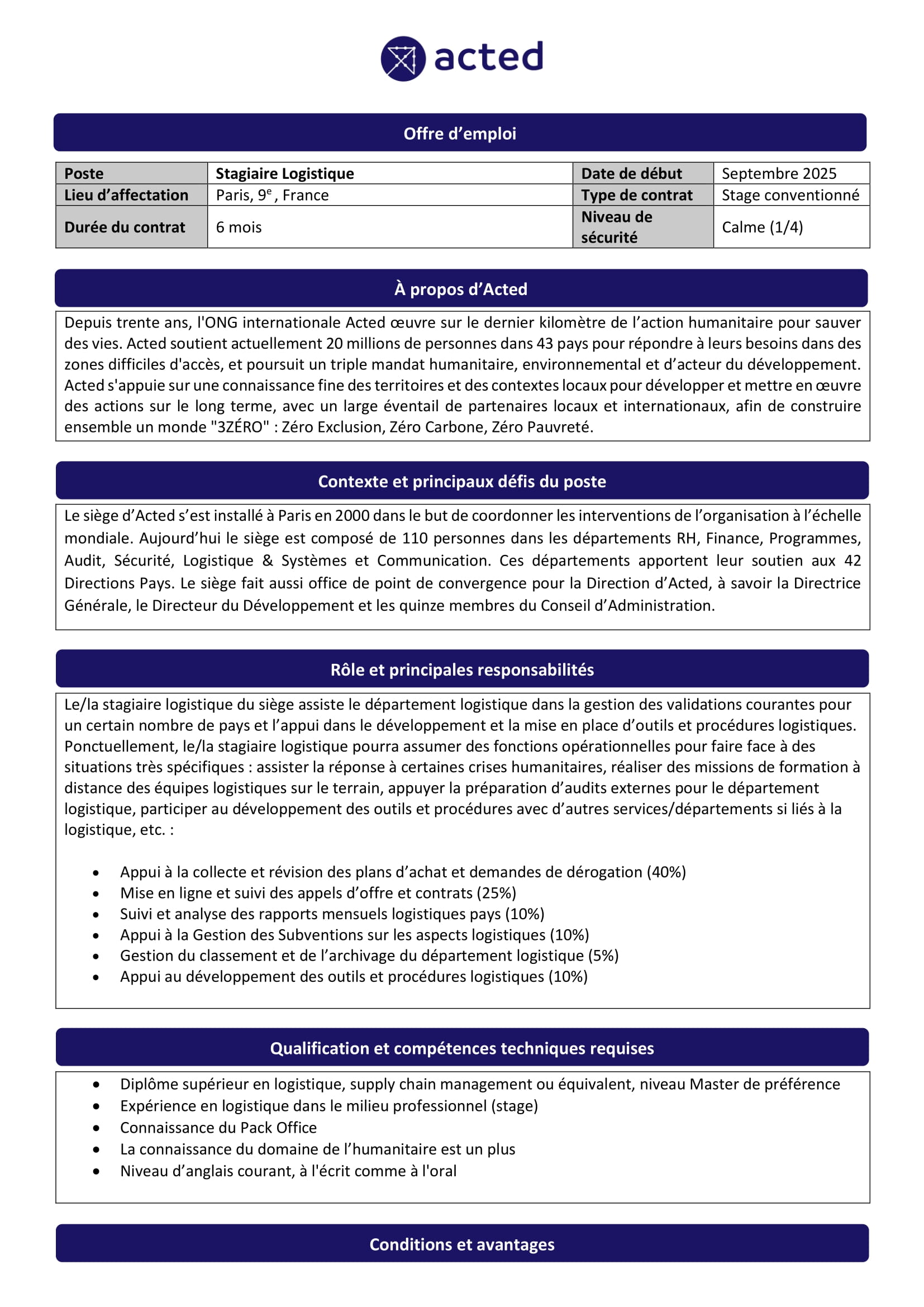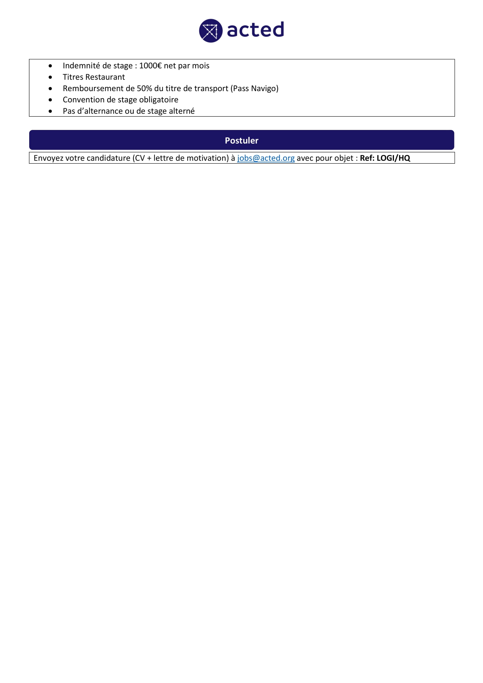 Acted recherche un stagiaire logistique, Paris, France Août 12, 2025 Acted recherche un stagiaire logistique, Paris, France Share on FacebookTweetFollow usSaveLe PNUD recrute un(e) stagiaire en Finance, CamerounAppel à candidatures pour les bourses internationales de troisième cycle de l’université des Arts de Londres (UAL),Royaume-UniUniversité Toumaï recrute un(e) chargé(e) de communication, N’Djamena, TchadLa World Vision recrute pour le poste d’Assistant Exécutif, N’Djamena, Tchad