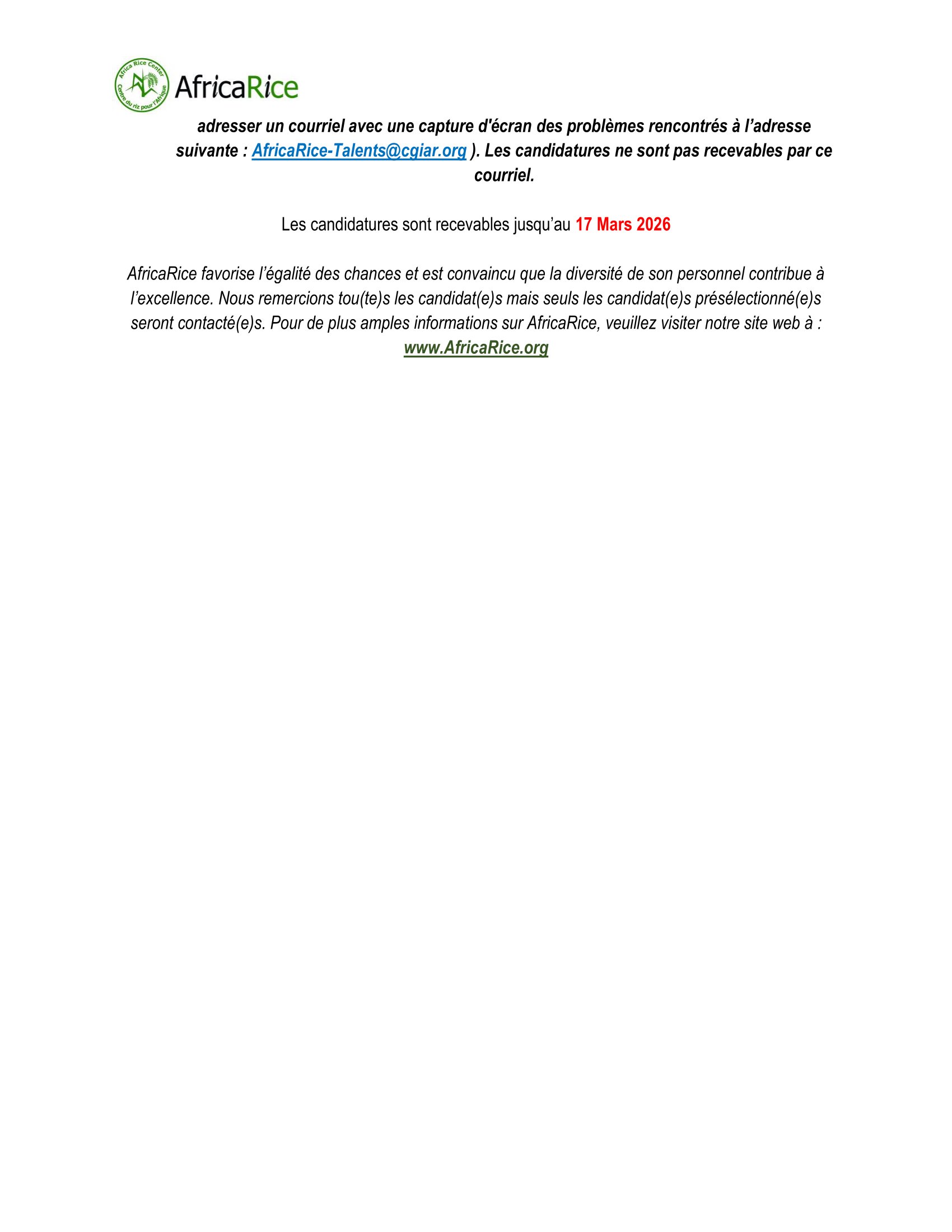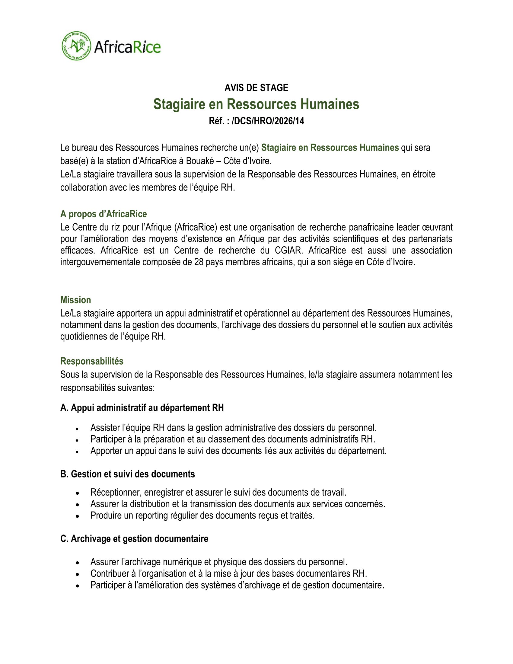 AfricaRice recherche un(e) Stagiaire en Ressources Humaines, Bouaké, Côte d’Ivoire Mar 7, 2026 AfricaRice recherche un(e) Stagiaire en Ressources Humaines, Bouaké, Côte d’Ivoire Share on FacebookTweetFollow usSaveFIDIS INVEST organise une formation certifiante en contrôle de gestion, en ligneMédecins du Monde recrute un stagiaire fundraising entreprises, fondations, philanthropie (F/H), Saint-Denis, FranceLe Ministère de la Production et de l’Industrialisation Agricole lance un avis d’appel à candidature au poste de techniciens en agroécologie pour le compte du projet RENFORT (ILSA), TchadAppel à candidatures pour le programme de bourses de doctorat Hong Kong, Chine