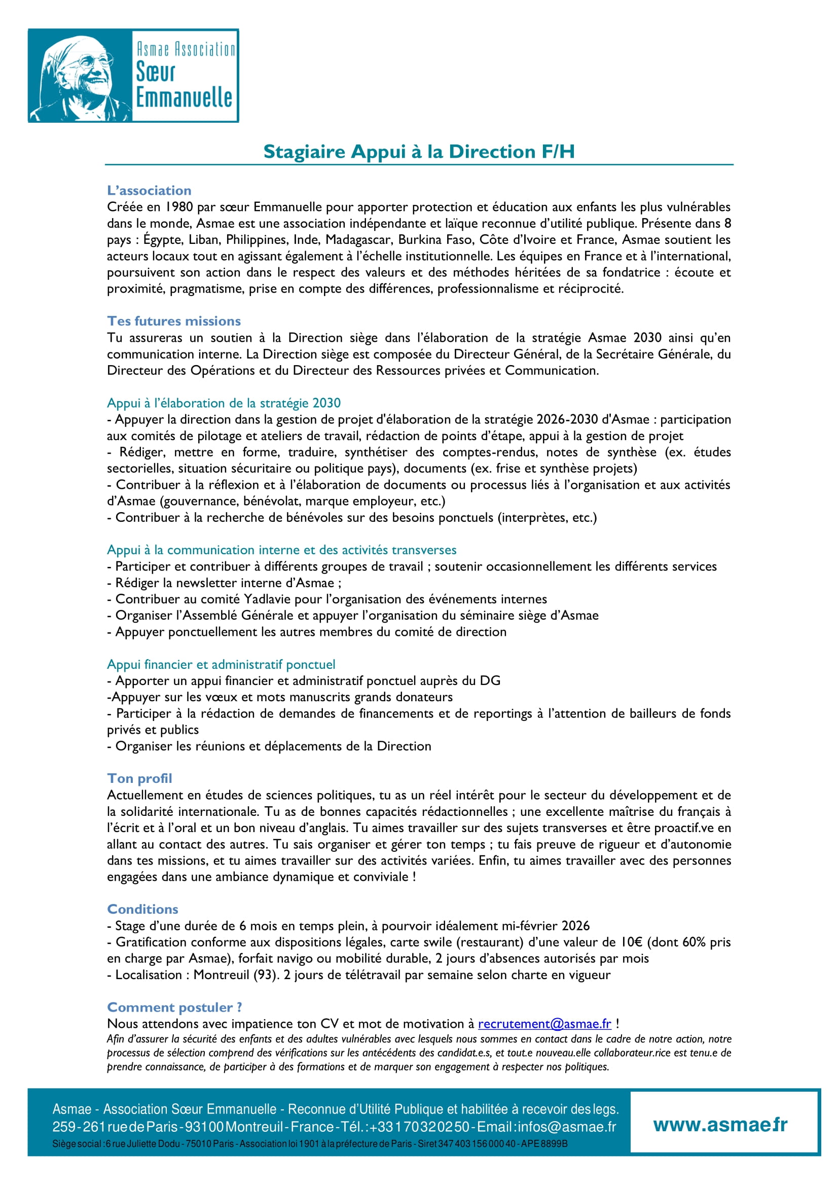 Asmae recrute un stagiaire appui à la Direction (F/H), Montreuil, France Nov 20, 2025 Asmae recrute un stagiaire appui à la Direction (F/H), Montreuil, France Share on FacebookTweetFollow usSaveGIZ recrute un conseiller(e) en gouvernance locale, Moundou, TchadCICR recrute deux comptables (H/F) basé(e)s à Adré/Bagasola, TchadUNICEF recrute un(e) Chargé(e) de programme Nutrition, Bol, TchadSolidaridad West Africa lance un avis de recrutement externe de Gestionnaire de centre de service rural Moundou ou Kelo, Tchad