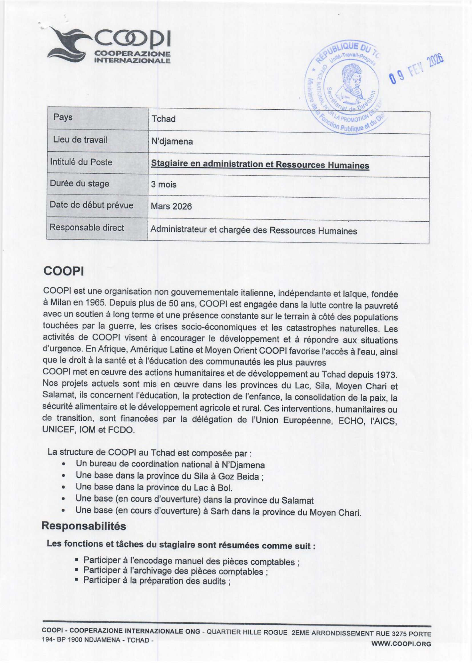 COOPI recrute un Stagiaire en Administration et Ressources Humaines, Ndjamena, Tchad Fév 11, 2026 COOPI recrute un Stagiaire en Administration et Ressources Humaines, Ndjamena, Tchad Share on FacebookTweetFollow usSaveLa Caritas Suisse recherche deux (02) expert(e)s en chaine de valeur farine 100%, N’Djamena, TchadL’ONG Développement Humain Durable (DHD) recrute un expert senior, spécialiste en gouvernance organisationnelle, N’Djamena, TchadAppel à candidatures pour le Programme d’échange d’été 2025 du Hansen Leadership Institute USABRISCOM recrute une assistante de direction et de gestion, Ouagadougou, Burkina Fasso