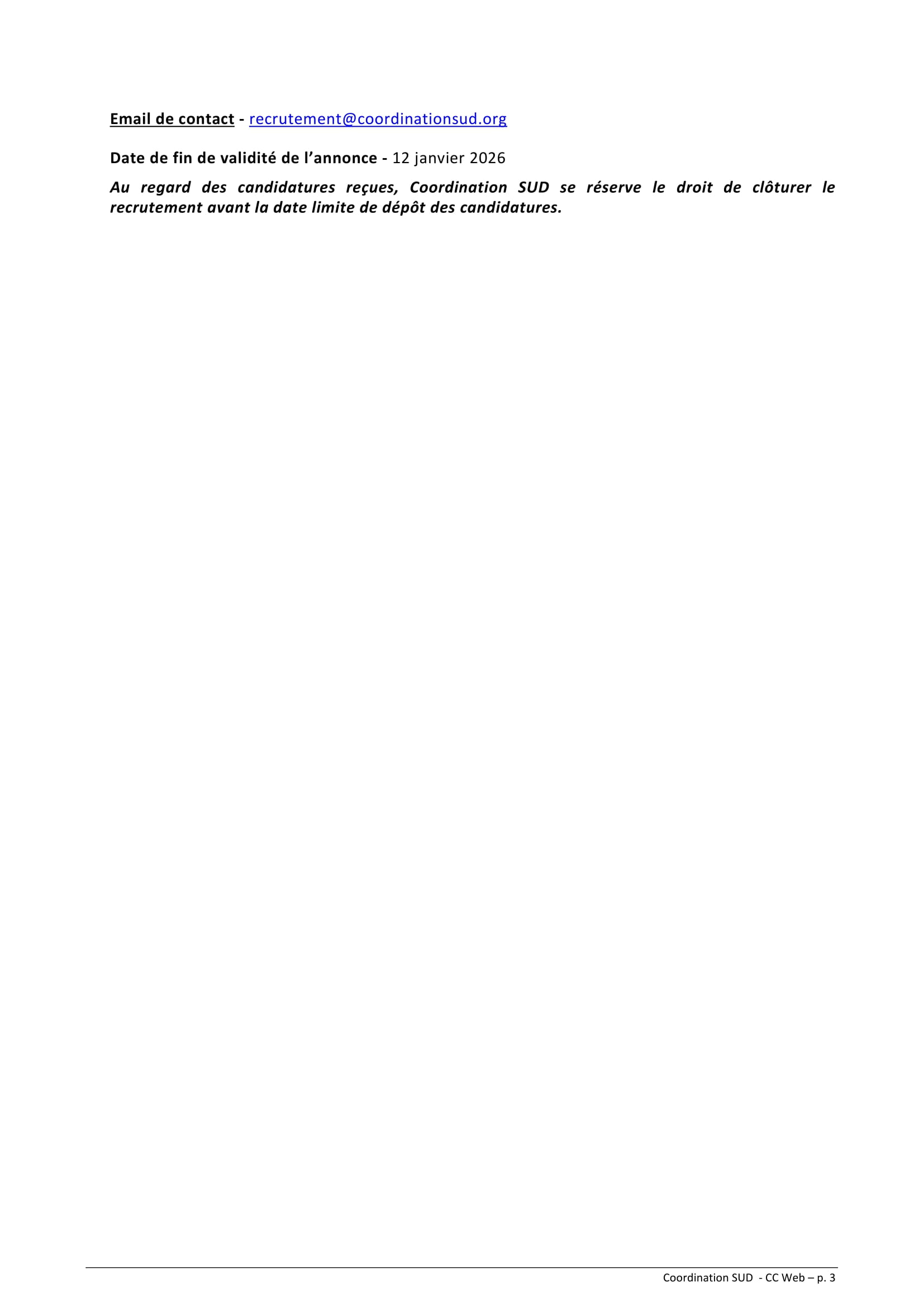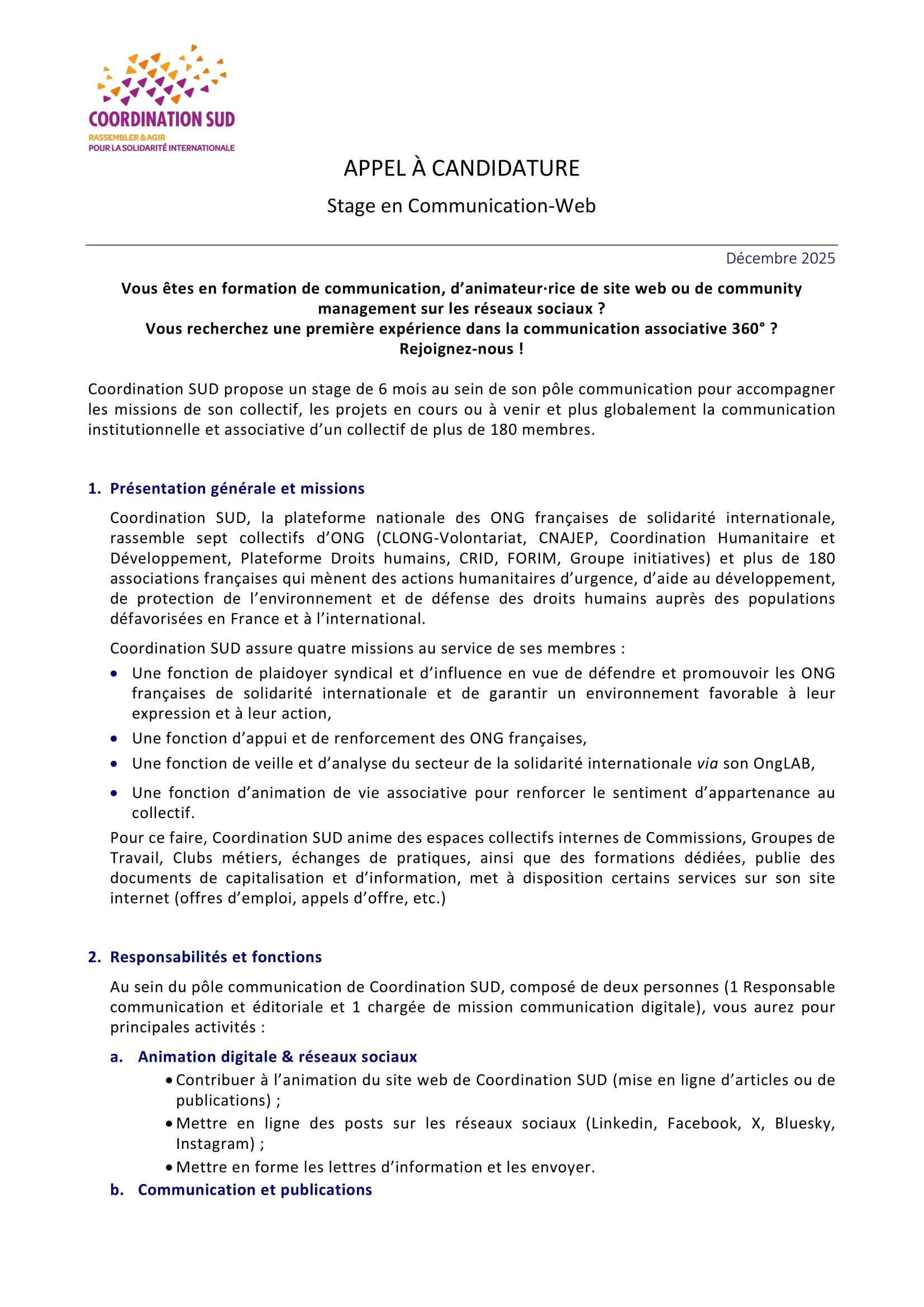 Coordination SUD recrute un stagiaire en communication-web, Paris, France Déc 18, 2025 Coordination SUD recrute un stagiaire en communication-web, Paris, France Share on FacebookTweetFollow usSaveGIZ recrute un conseiller(e) en gouvernance locale, Moundou, TchadCICR recrute deux comptables (H/F) basé(e)s à Adré/Bagasola, TchadUNICEF recrute un(e) Chargé(e) de programme Nutrition, Bol, TchadSolidaridad West Africa lance un avis de recrutement externe de Gestionnaire de centre de service rural Moundou ou Kelo, Tchad