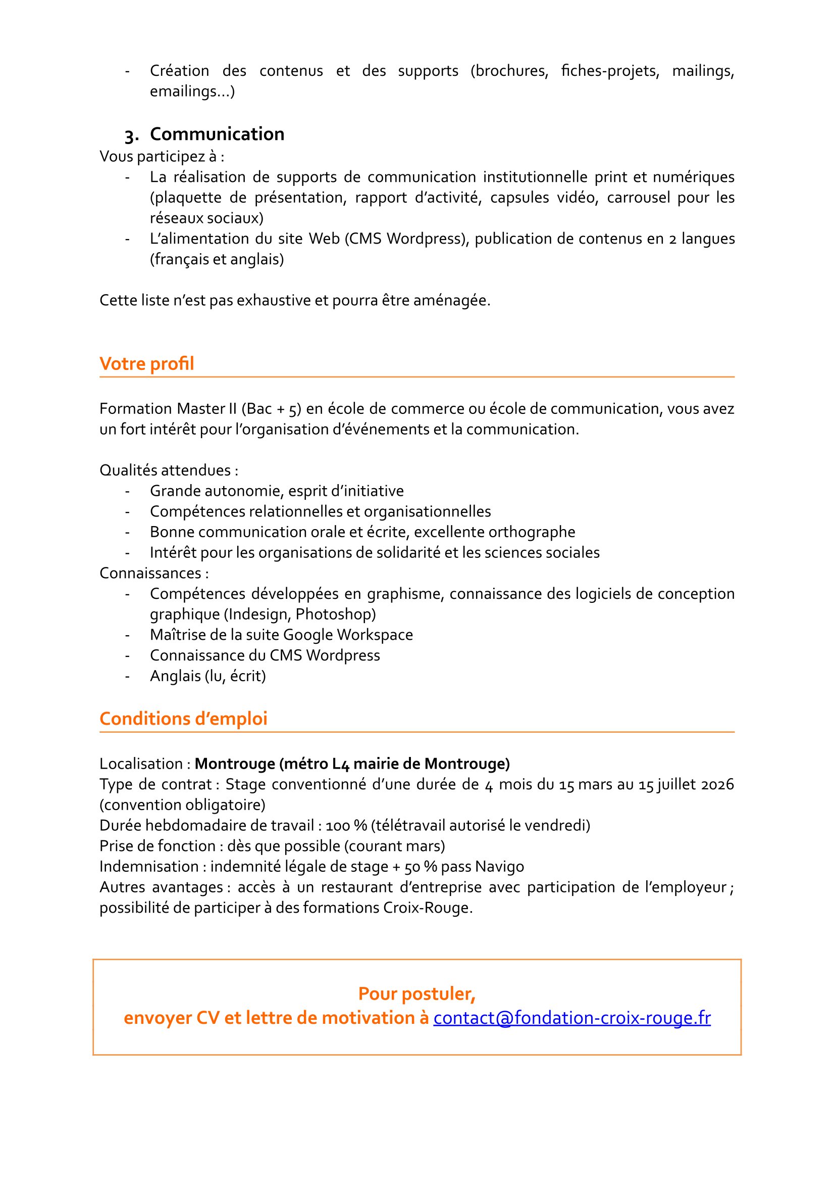 La Fondation Croix-Rouge française recrute un(e) Stagiaire Chargé(é) de projets Marketing et évènementiel scientifique, Montrouge (Ile-de-France) Mar 11, 2026 La Fondation Croix-Rouge française recrute un(e) Stagiaire Chargé(é) de projets Marketing et évènementiel scientifique, Montrouge (Ile-de-France) Share on FacebookTweetFollow usSaveRelief International recrute pour le poste de pharmacien, Wadi Fira, TchadL’ONG Terre Des Hommes : lancement du Certificat Universitaire sur les Droits de l’Enfant et la Justice pour Enfants, Burkina FasoLa Fédération Luthérienne Mondiale (FLM) lance un avis d’appel d’offres pour Assistance multisectorielle aux communautés les plus vulnérables dans la province du Lac, TchadLe Cabinet FIDIS Invest lance une certification en Technique Bancaire et Financière