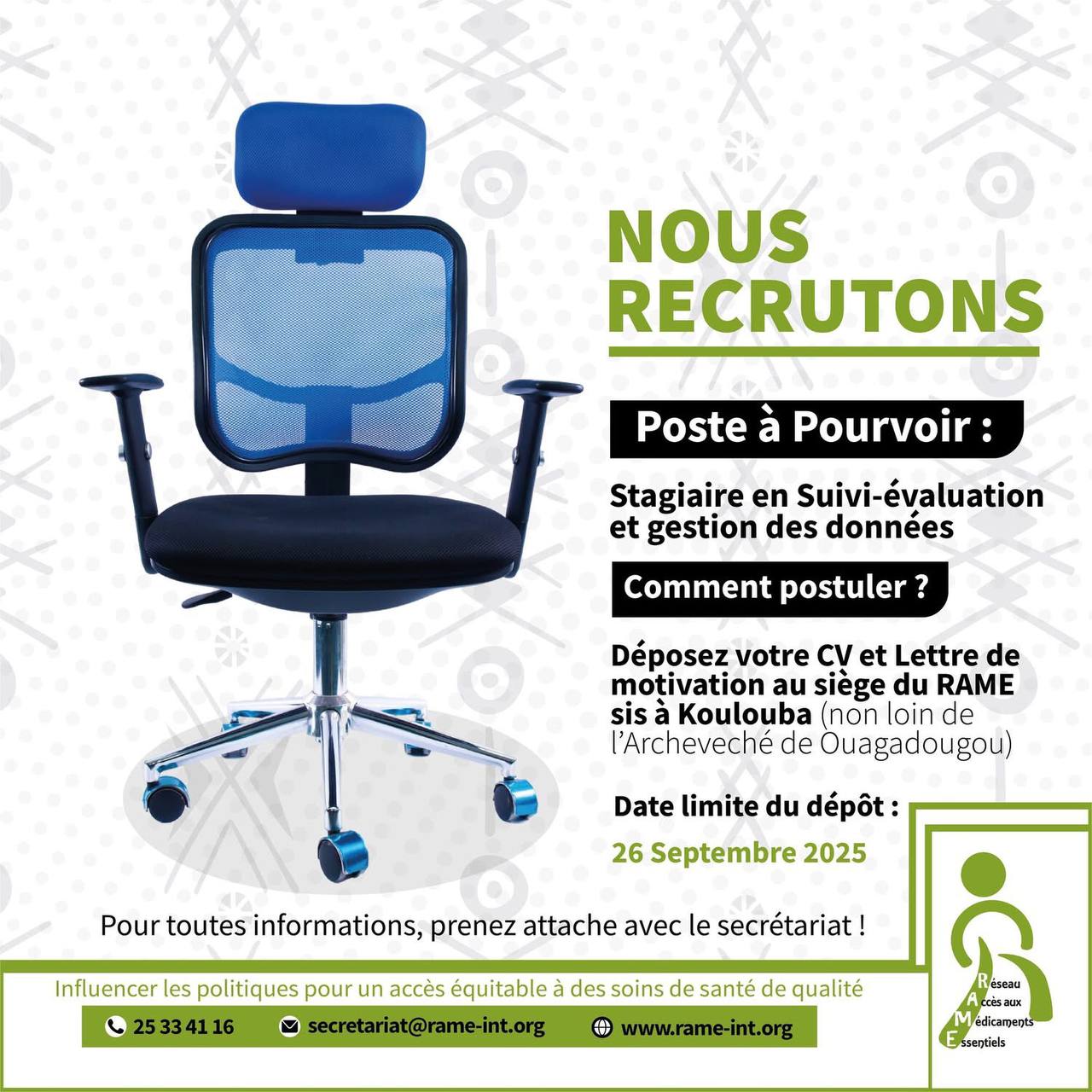 Le Réseau Accès aux Médicaments Essentiels (RAME) lance un appel à candidatures pour le recrutement d’un(e) stagiaire en Suivi-évaluation et gestion des données, Ouagadougou, Burkina Faso