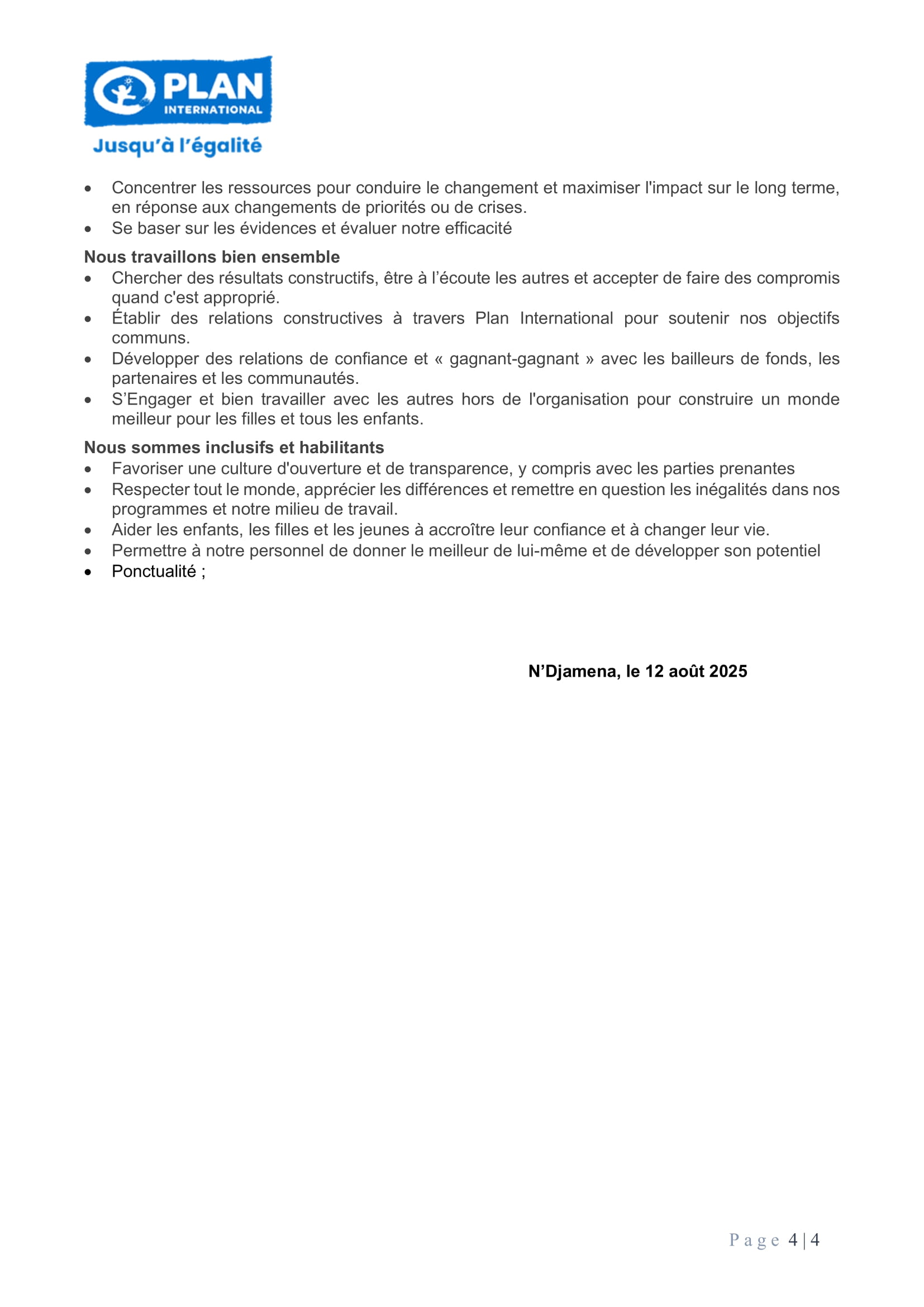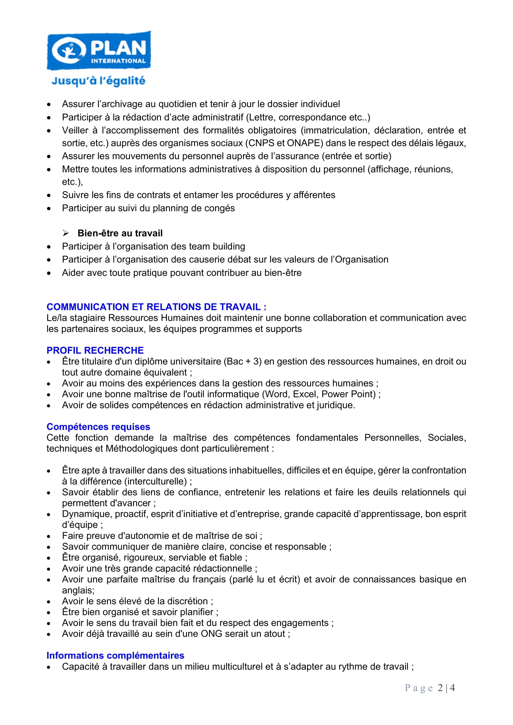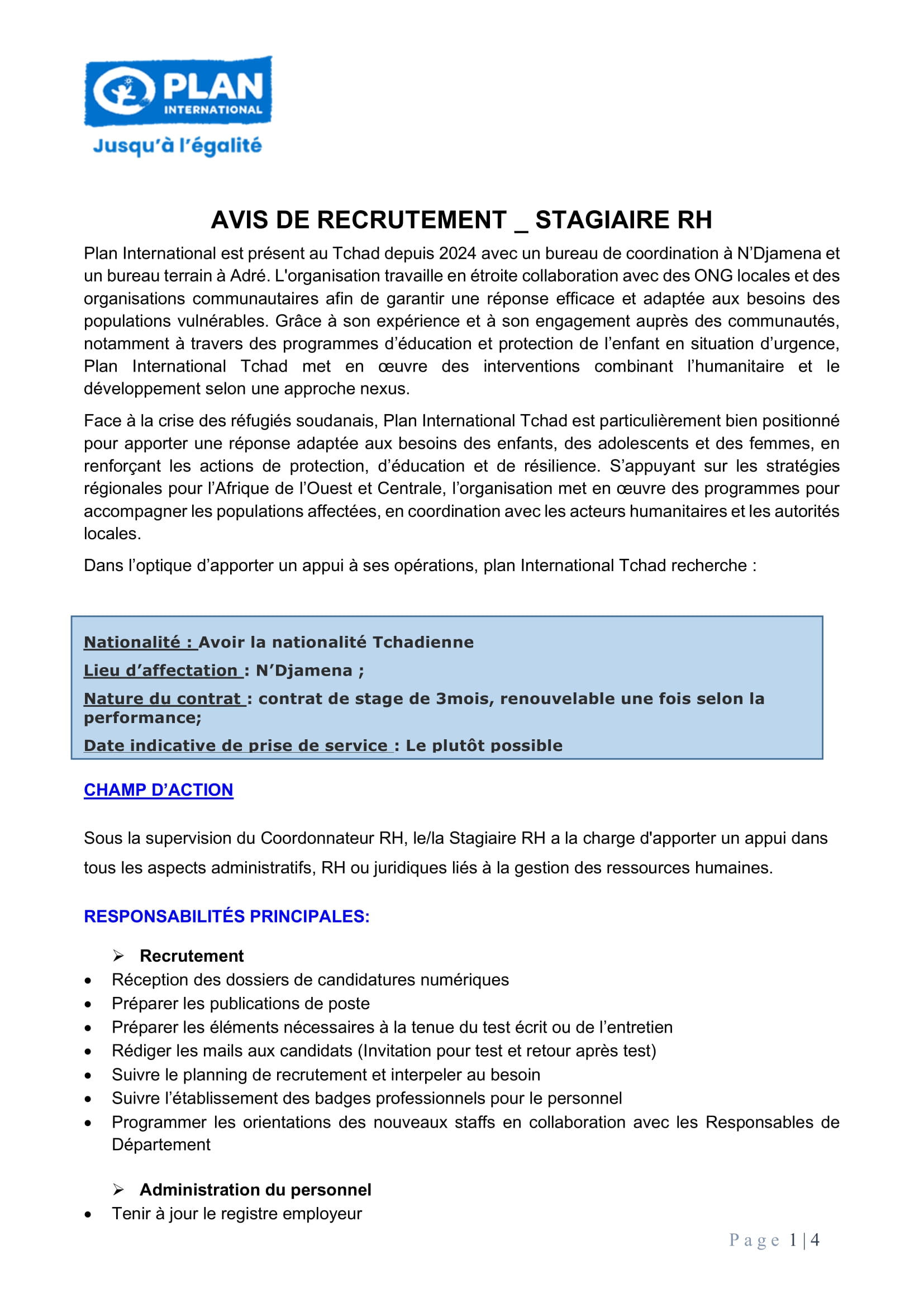 Plan International recherche un stagiaire RH, N’Djamena, Tchad